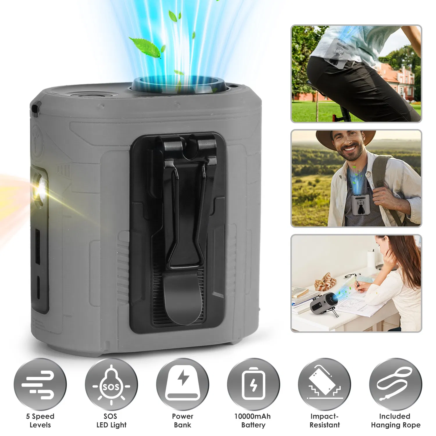 *5 In 1 Multifunctional Clip Fan*:This innovative fan combines the functions of waist clip fan,desk table fan,and neck fan into one compact fan. You can easily attach this belt fan to your shirt or belt for hands-free cooling while on the go. Come with length adjustable hanging rope,allows you to wear the fan around your neck. This fan can be securely placed on desks or tables due to its foldable bracket on the clip. Also serves as an emergency power bank. Moreover,built-in LED light with flash mode makes this battery powered fan perfect for nighttime use and outdoor adventures.